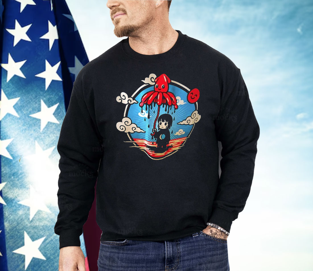 Cute Squid Umbrella Protecting Sad Girl Surreal Ocean Cartoon Shirt